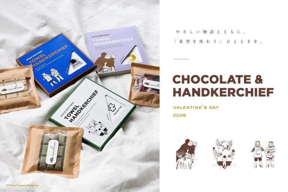 このバレンタインギフトは、『宇宙兄弟』の名シーンをデザインしたオリジナルハンカチと、物語に寄り添うフレーバーのチョコレートがセットになっています。手にした人の心にそっと希望や温かさを届け、誰もが自分らしく前へ踏み出せる社会を目指しています。