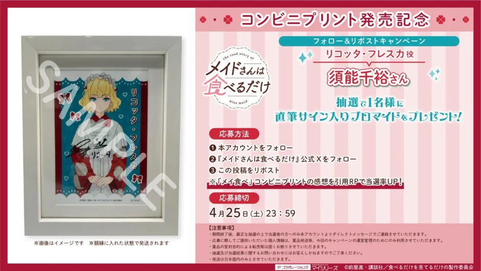 コンビニプリントの発売を記念し、豪華なプレゼントキャンペーンが実施中です。リコッタ・フレスカ役の須能千裕さんの直筆サイン入りブロマイド(額縁入り)が、抽選で1名に当たります。